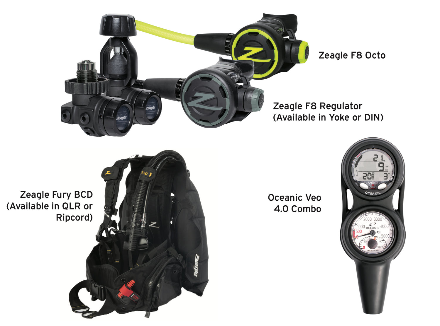 - Complete scuba diving gear package: Fury BCD, F8 Regulator (Yoke or DIN), F8 Octopus, Oceanic Veo 4.0 Combo.
