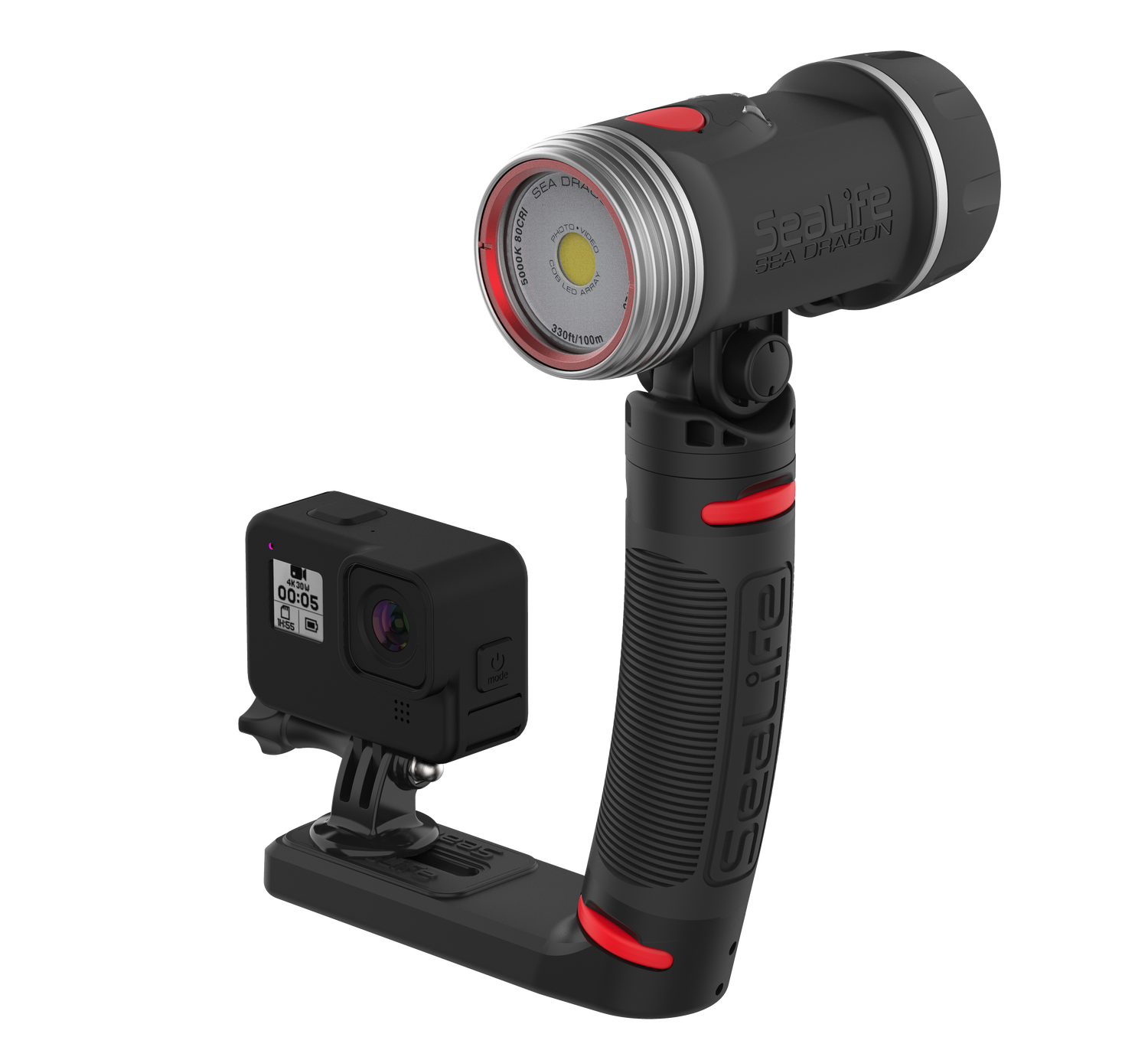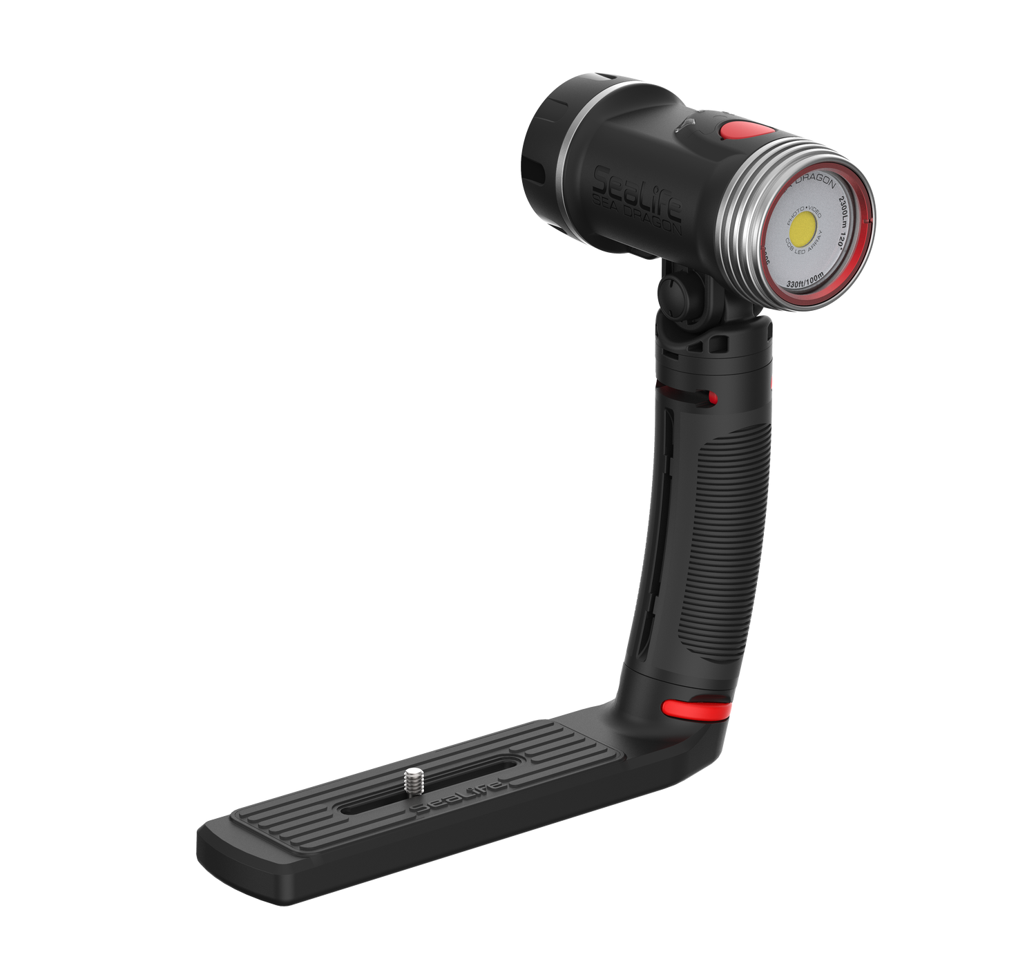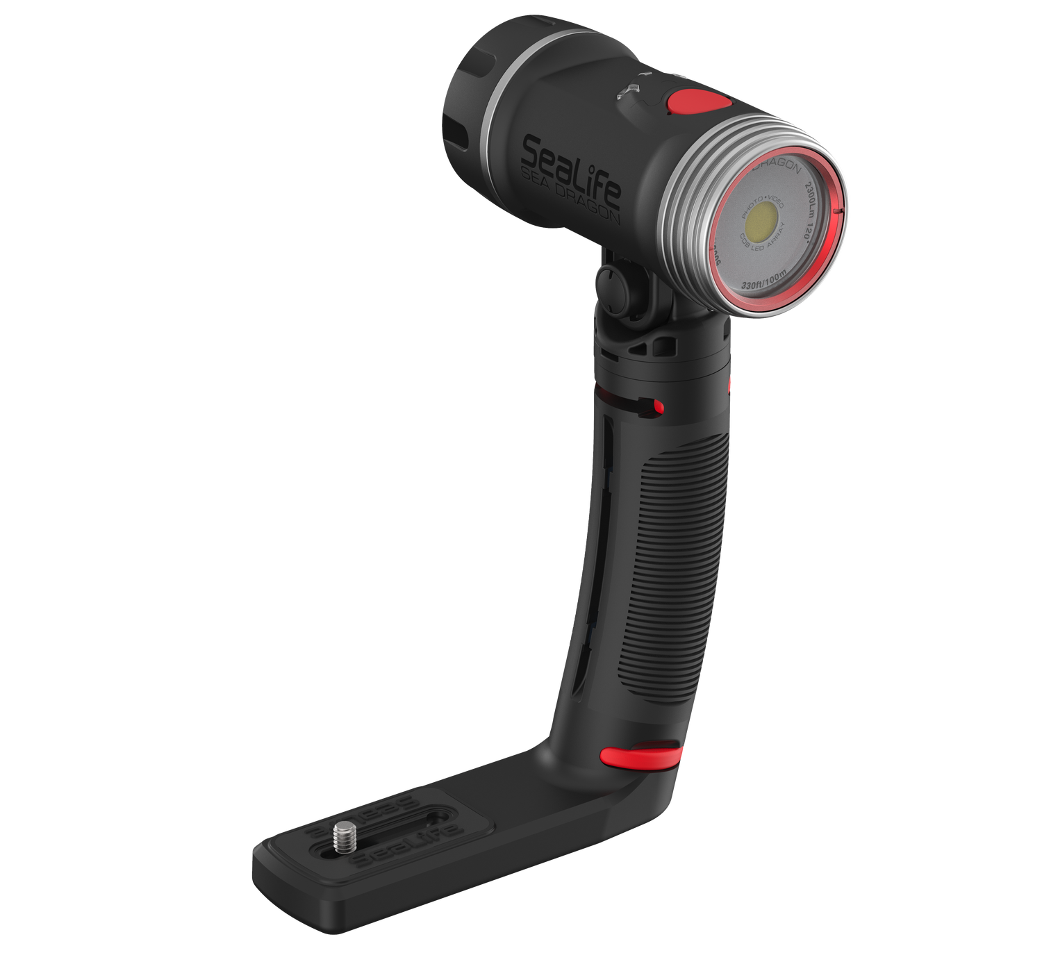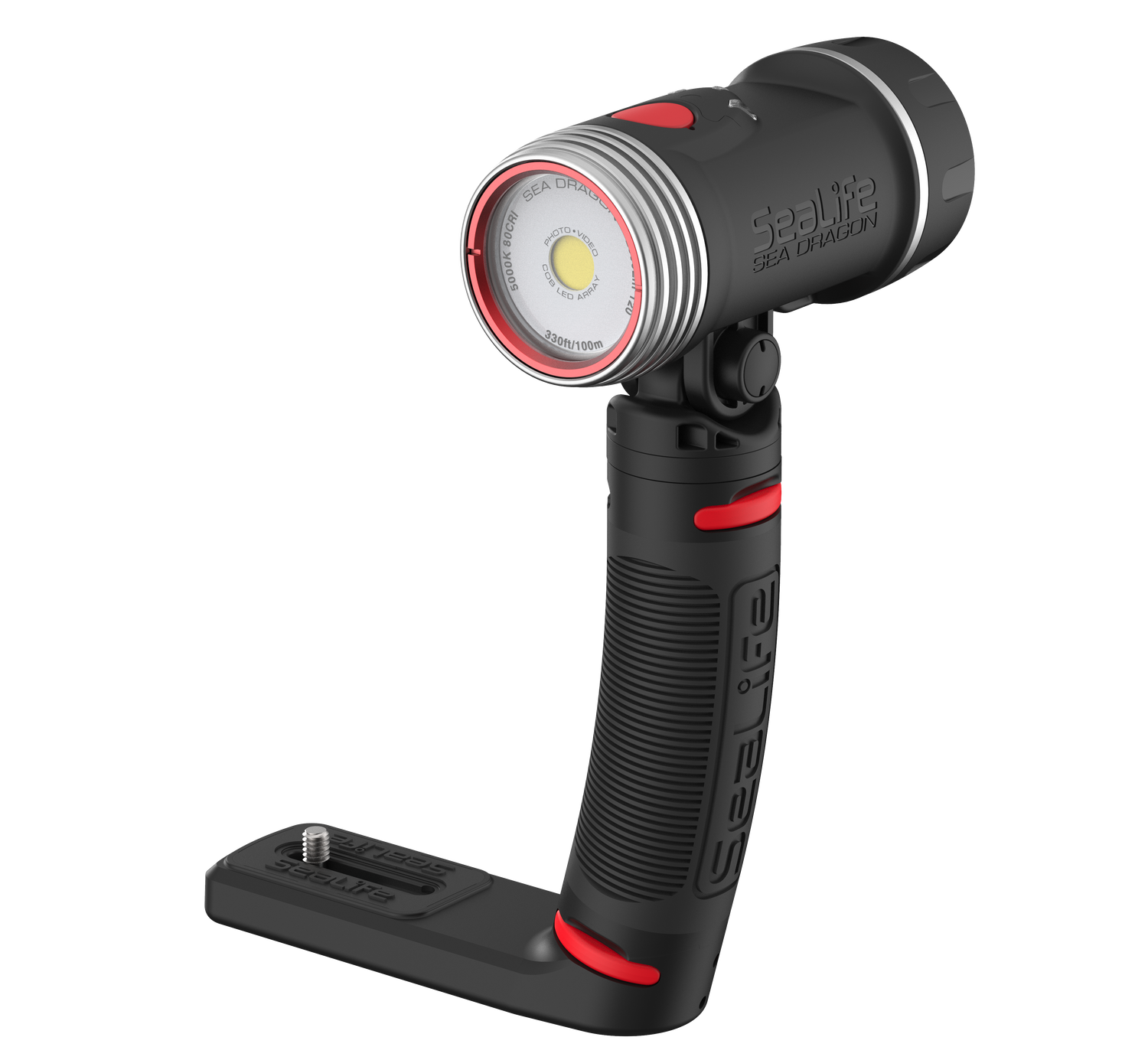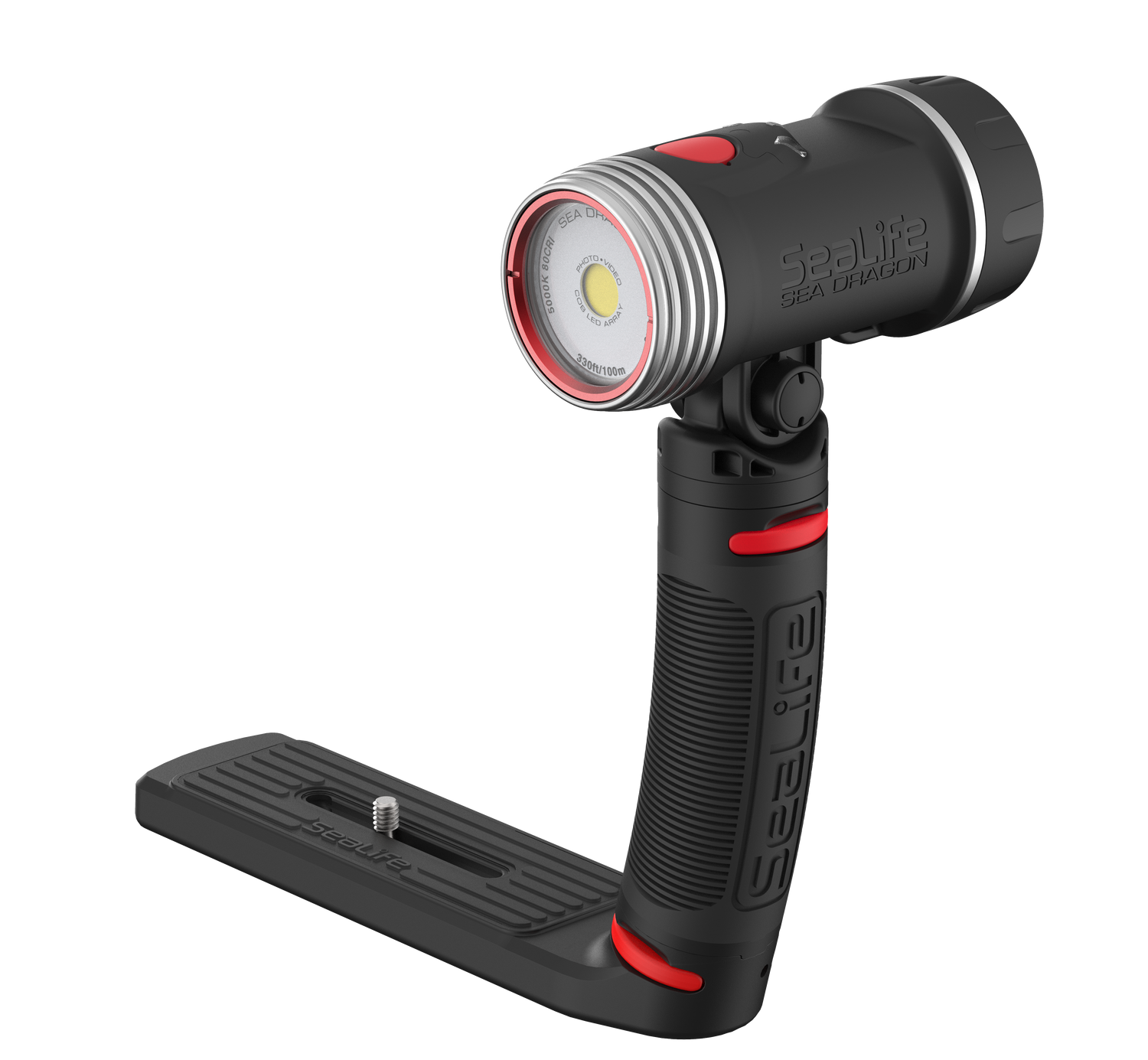 High-performance 3000 Lumen Underwater Photo-Video Light with Color Boost The Sea Dragon underwater photo-video light delivers 3000 lumens in a 120° wide beam without hotspots. A 90 CRI (color rendering index) COB LED array simulates natural sunlight, allowing the user to capture vibrant colors and sharp details in underwater photos and videos. The new patent pending SeaLife Color Boost™ mode combines specific red and white light frequencies, producing a warm and vibrant underwater color effect. Red is the first color in the visible light spectrum filtered out by water. The light’s Color Boost feature replenishes the lost red for a balanced, warm color effect. The new dial design delivers fast, intuitive power and brightness control. Rotate to power on/off and adjust brightness. Push the dial to switch between Color Boost and white light modes. Brightness can be smoothly and evenly adjusted from 300 to 3000 lumens without steps or clicks. Adjusting the brightness in Color Boost mode maintains the color temperature of 3900K. The light can be used as an emergency signaling device by pushing the dial down for 5 seconds. Push and release the dial will switch between SOS, Blinking and Red-only modes. The red-only mode is useful for night dives, so you won’t scare off light-sensitive sea creatures. The SOS and Blinking modes has a 20+ hour run time with full battery charge. Rotate the dial all the way counterclockwise to exit emergency signal mode and power off the light. Includes a powerful 3400 mAh Li-ion battery with protected circuitry delivers 60-minute run time at full power. Includes Flex-Connect grip and tray for mounting to any camera with standard ¼-20 tripod threads. Easy to expand with Flex-Connect™ system of trays, grip and Flex Arm.