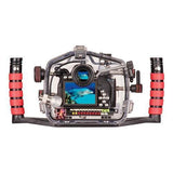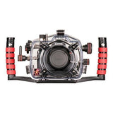 Superior flash controlDirect connect flash is the most reliable and efficient way to fire an external underwater strobe. The camera's built-in flash does not need to fire, providing the extended battery life and no lag between exposures. Our proprietary circuitry allows direct communication between the camera and current Ikelite DS Substrobes* for the most accurate through-the-lens (TTL) metering control of an off-camera flash. Electrical bulkhead and TTL circuitry are provided standard and included in the base purchase price. Rather than reaching out to your external strobe, exposure with a current DS Substrobe can be adjusted quickly through the back of the housing using two pushbuttons. Settings are clearly indicated even at night by a series of LED lights. TTL mode provides four half f/stop increments over or under flash compensation to fine tune exposure. Or control strobe output completely through the back of the housing using one of the 8 manual power settings provided in half-stop increments. Ergonomic handlingControls are provided for every camera function except the Diopter Adjustment Control and Flash button. Shutter, video recording start/stop, and a large zoom control knob can all be comfortably reached without removing your hands from the handles. Comfortable rubberized grips provide quick-release attachment points for strobes and accessories. The try and handles may be removed from the housing for convenience in traveling. The complete housing is neutral or slightly negative in freshwater depending on choice of lens port. Reliable performanceA clear view of the camera and o-ring seals facilitates easy assembly and operation. Heavy-duty polycarbonate construction is durable and corrosion-free to ensure performance in even demanding conditions. Lens ports can be removed and replaced quickly with a simple positive locking system which provides visible assurance when the housing is assembled properly.