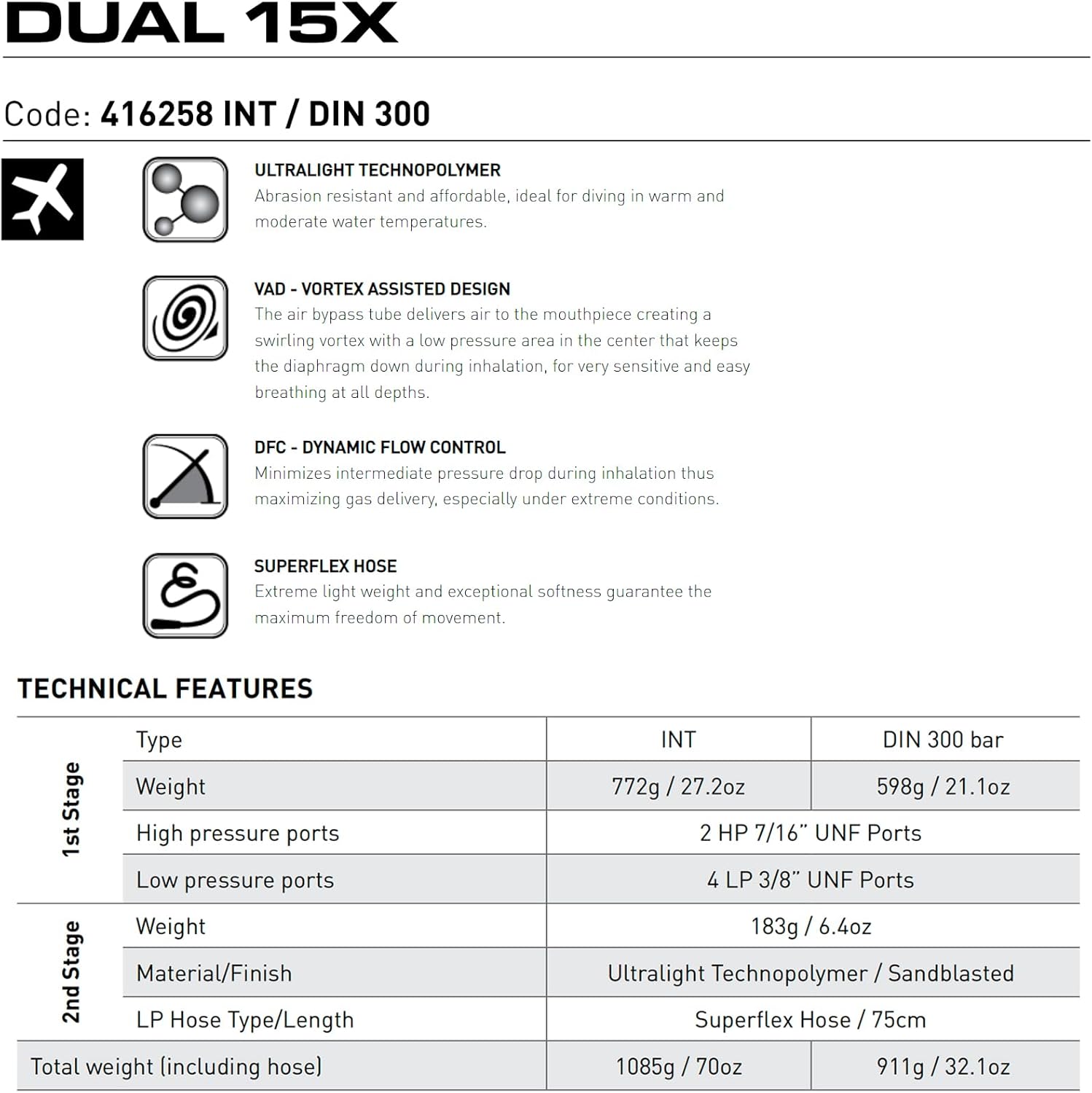 The Mares Dual 15X Regulator is a lightweight option for scuba diving, designed for novice divers seeking a simple, reliable breathing system. It features a 15X first stage with an ACT valve and a compact second stage (183 g), delivering dependable performance in a streamlined package for diving and training scenarios.