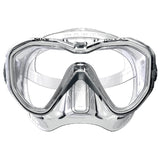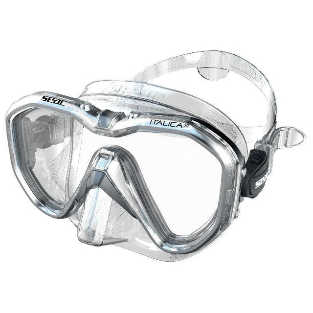 The Seac Italica is a single-lens diving mask, Made in Italy, that has been specifically designed for recreational and professional scuba diving, which focuses its attention to detail and offers an attractive design. The frame of the Seac Italica mask is made from a durable polycarbonate and houses a single-lens in tempered Ultra Clear optical glass with a thickness of 3 mm. The frame inserts are finished in an attractive chromed metal and the screws are in stainless steel. The Seac Italica is available in the Regular and Asian Fit versions, with different skirts in soft hypoallergenic silicone in transparent, white and black colours. A feeling of perfect comfort is guaranteed by the tilting and folding buckles on the sides of the mask and by the adjustable straps that fix the mask firmly. The Seac Italica diving mask in black hypoallergenic silicone is available with transparent lens and mirrored lens that increases the contrast of light and visibility under water by upto 45%. The Seac Italica scuba diving mask is sold in a protective transparent box.
