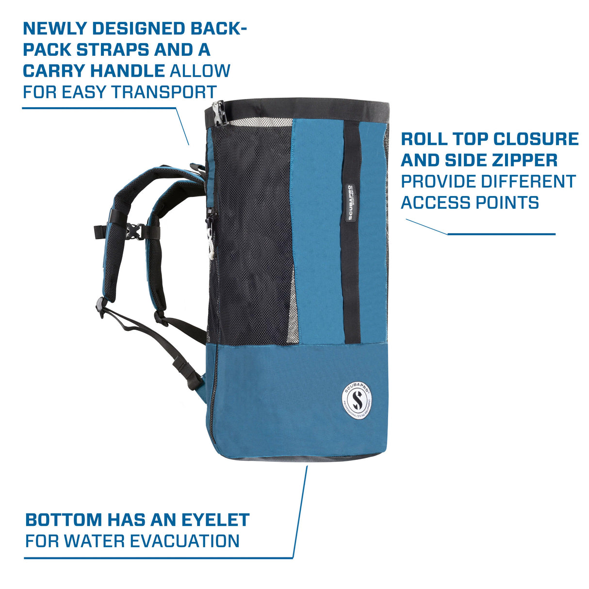 - Materials and construction: 600 Denier Polyester/PU with mesh panels and a durable bottom for reef-ready gear transport.