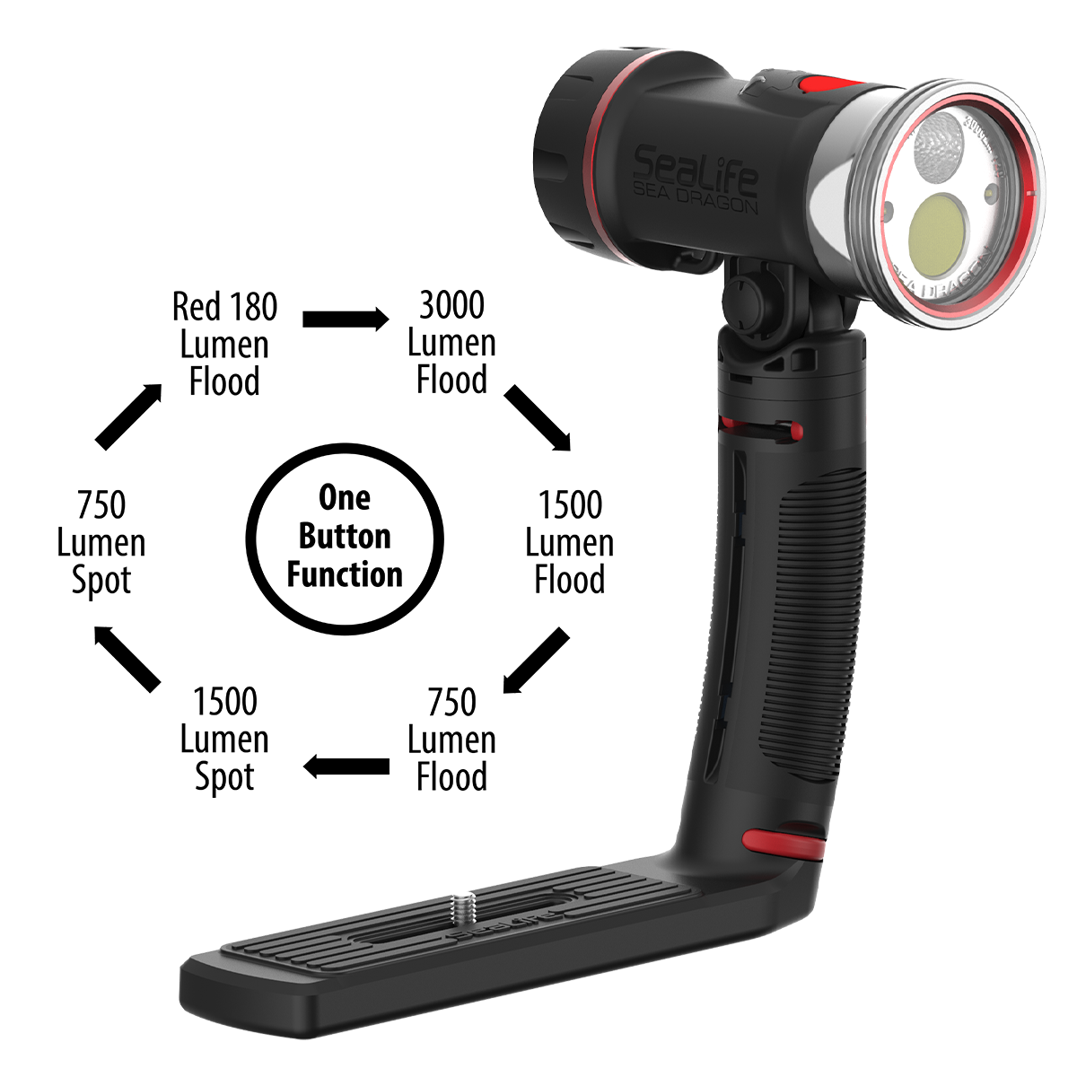 Micro 3.0 Features16 megapixel Sony IMX083 CMOS 1/2.3” image sensor iCatch V50 DSP processor 4K Ultra HD Video @ 30fps and 1080p HD video @ 120 fps (Super Slo-Mo) 260K hi-res 2.4” TFT color LCD Permanently sealed – No waterproof door or O-rings to maintain Ultra-fast 0.1 second shutter response – Virtually no shutter lag Easy Setup with five Land & Sea™ scene modes: Three built-in digital underwater color correction filters (white balance modes): Manual White Balance Adjustment to customize underwater color correction to your specific depth and water conditions Continuous Burst Shooting – shoots 10 high resolution 16MP JPEG pictures in 1 second RAW image format – Hi-res, uncompressed .DNG image files for virtually unlimited photo editing options 100° Wide angle lens – 7 element, fully multi-coated, aspheric optical lens Stabilization – Electronic stabilization reduces vibration and shake for smooth video recording “Piano Key” button controls for easy operation, even with dive gloves on Wireless – Preview, download and share pictures/videos to smart phone or tablet with free Micro 3+ app 64GB internal memory holds 10,000 16mp pictures, 140 minutes 4K-30fps video, 205 minutes 1080p-60fps, or 560 minutes 1080p-30fps HD video Waterproof to 200ft / 60m Picture in Video – capture 8mp still images while recording 4K video Compact design for easy handling and lightweight travel Fully rubber-armored and impact resistant Focus distance from 15” (38cm) to infinity Time lapse shooting at set time intervals – Saves as video file or series of still images Upside-down shooting mode – When mounting camera upside down, pictures and videos are saved upright Shortcut mode – Push and hold menu button to quickly access a specified menu setting 2000 mAh / 3.7V / 7.4Wh internal lithium ion rechargeable battery for 3+ hours video or 1000+ images External power mode – Connect and operate camera with external power supply (land only) LED status light – Confirms charging and transfer status Soft textured rubber grip design for sure grip Sea Dragon Pro Dual Beam Features Powerful 3000 lumen wide beam COB LED (BridgeLux V18 COB LED) and 1500 lumen narrow beam LED (Luminus SST-40-W LED) 90 Color Rendering Index (CRI) that mimics natural daylight One button control for easy operation. One button to power light on/off and select brightness 6 Light modes: Flood 100%, 50%, 25%; Spot 100%, 50%; One red light mode 60-minute run time at full power Constant brightness – Regulated circuitry so light won’t dim with battery power Easy to expand with Flex-Connect™ trays, grip and flex arms Quick-release button to detach light and aim in crevices and hard to reach areas 120° wide beam evenly illuminates the subject with no hot spots (90° underwater) 15° narrow beam for long reach and creative snoot effect (11° underwater) Emergency mode emits blinking light or SOS signal to alert others of distress. Activated by holding down power button for 5 seconds from power off state Depth rated to 330 ft (100m) Corrosion-proof metal light head for heat dispersion and durability Removable 25Wh 3400 mAh Li-Ion battery w/ charger and international plug adapters included Waterproof battery compartment protects internal electronics even if light accidently floods Includes standard single tray, grip and compact travel case Mounting tray with universal ¼-20 screw fits all SeaLife and other brands