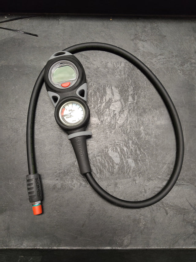 The Mares Mission Puck 2 console includes the Puck computer and a compact, easy-to-read pressure gauge with an ergonomically shaped chrome-plated brass body.