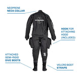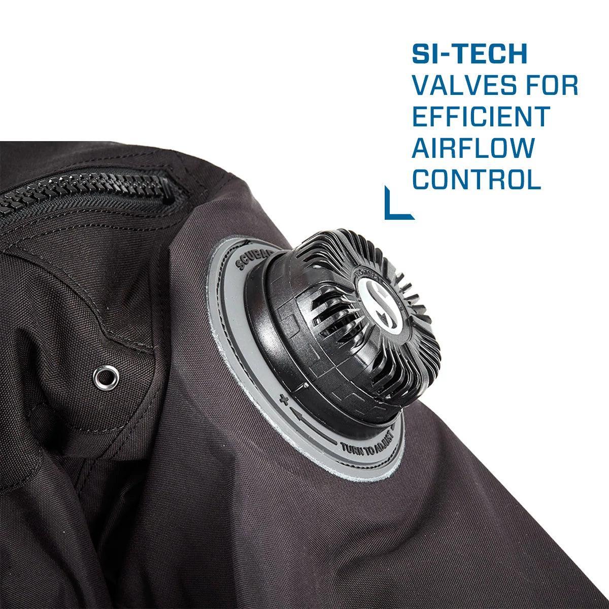 The updated Evertech Dry Breathable is a premium trilaminate drysuit designed for avid divers. Built with a breathable fabric nylon/PU/nylon trilaminate blend, stitched and waterproof taped seams, a diagonal front waterproof zipper, a Si-Tech ring seal system and Si-Tech valves, this drysuit is top quality throughout. For 2019, a neoprene neck collar has been added to keep the hood in place, the Si-Tech valves are now mounted on stitched and glued pads to ensure trouble-free airflow control, and the attached semi-rigid dive boots feature new soft yet protective soles. Large cargo pockets and blue suspenders are among the features included on a suit designed to keep you warm, dry and comfortable in all water conditions.